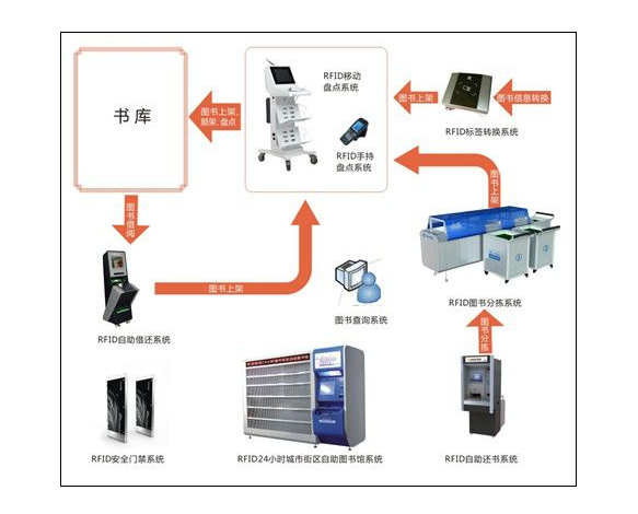 RFID könyvkezelő rendszer, beleértve a címkeátviteli rendszert, az önsegítő kölcsönzőrendszert, az önsegítő visszavételi rendszert, az intelligens keresőrendszert, a tolókocsi-leltározási rendszert és a széfkapu-ellenőrző rendszert.